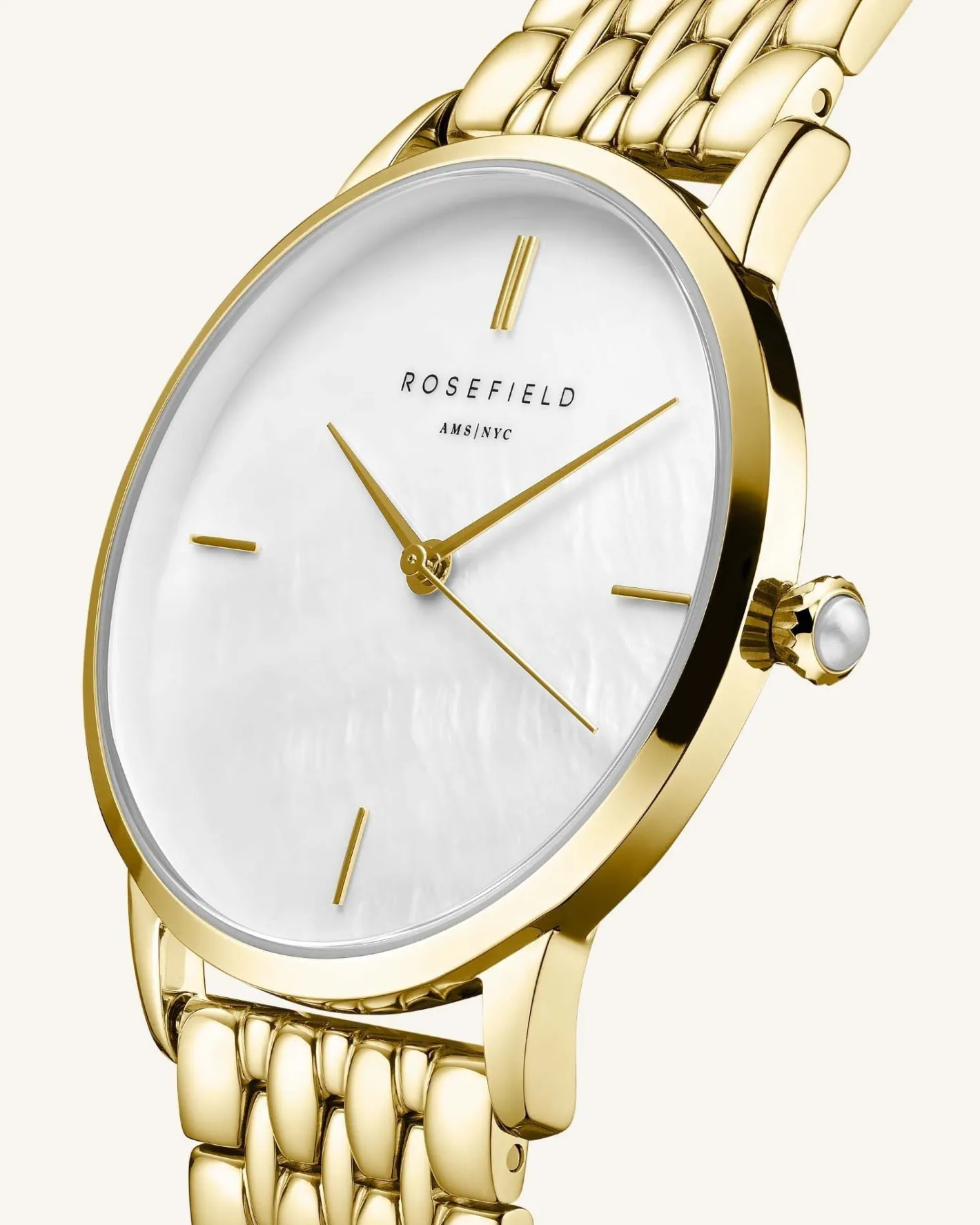 Time to circle back with the Pearl Edit — a reinvented classic with a Mother of Pearl Twist. A slightly bigger round watch with a 36mm case and a shiny Mother of Pearl dial and a pearl surprise featuring on the clock’s crown.