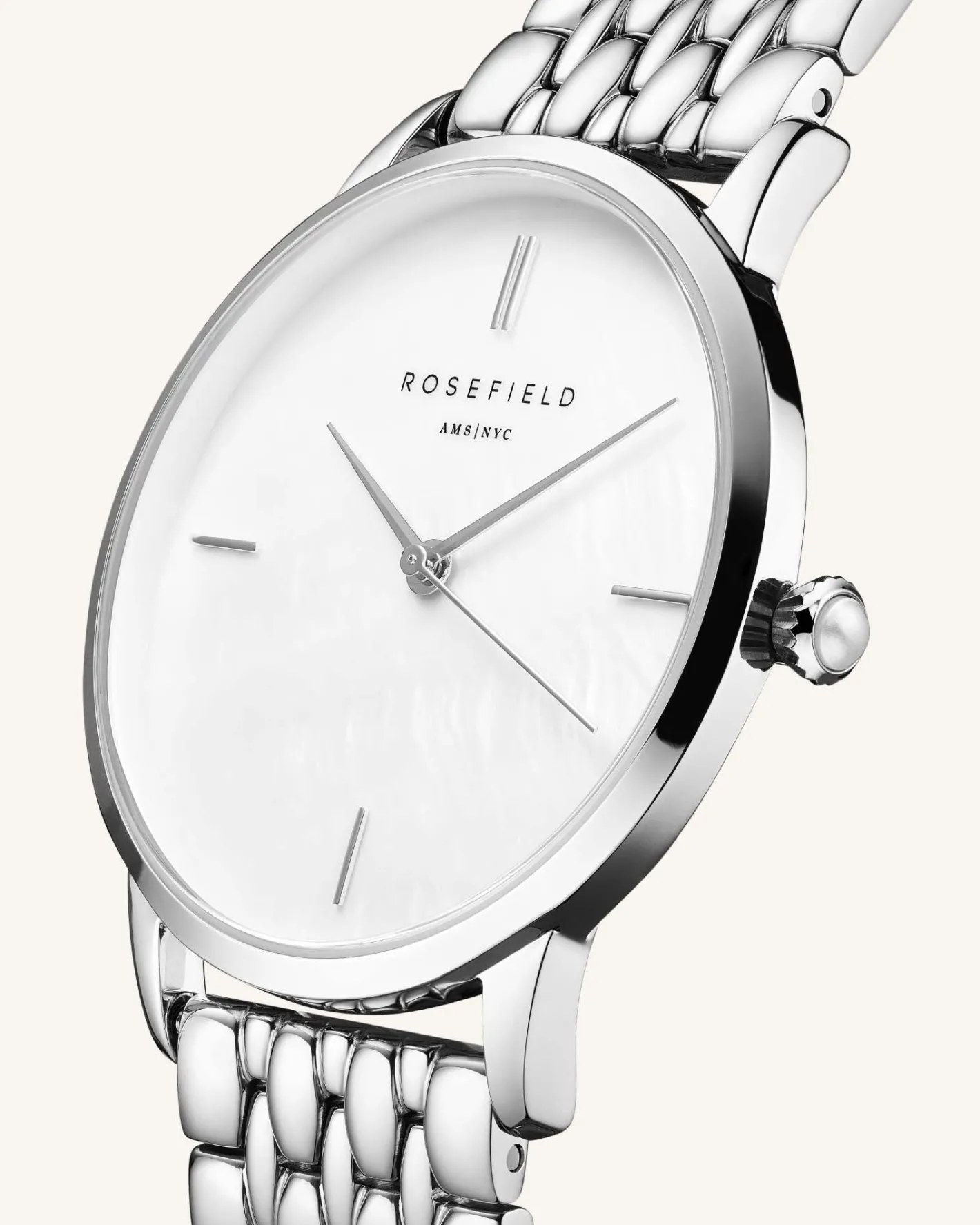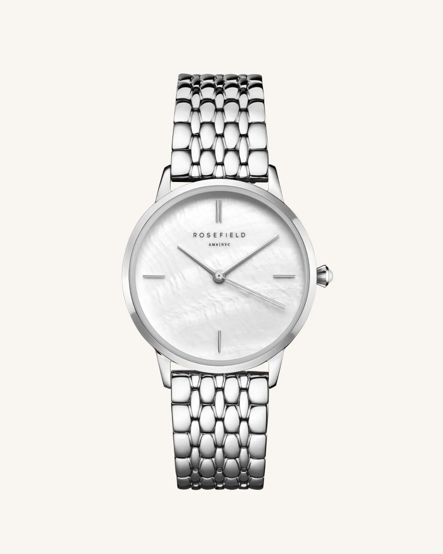 Time to circle back with the Pearl Edit — a reinvented classic with a Mother of Pearl Twist. A slightly bigger round watch with a 36mm case and a shiny Mother of Pearl dial and a pearl surprise featuring on the clock’s crown.