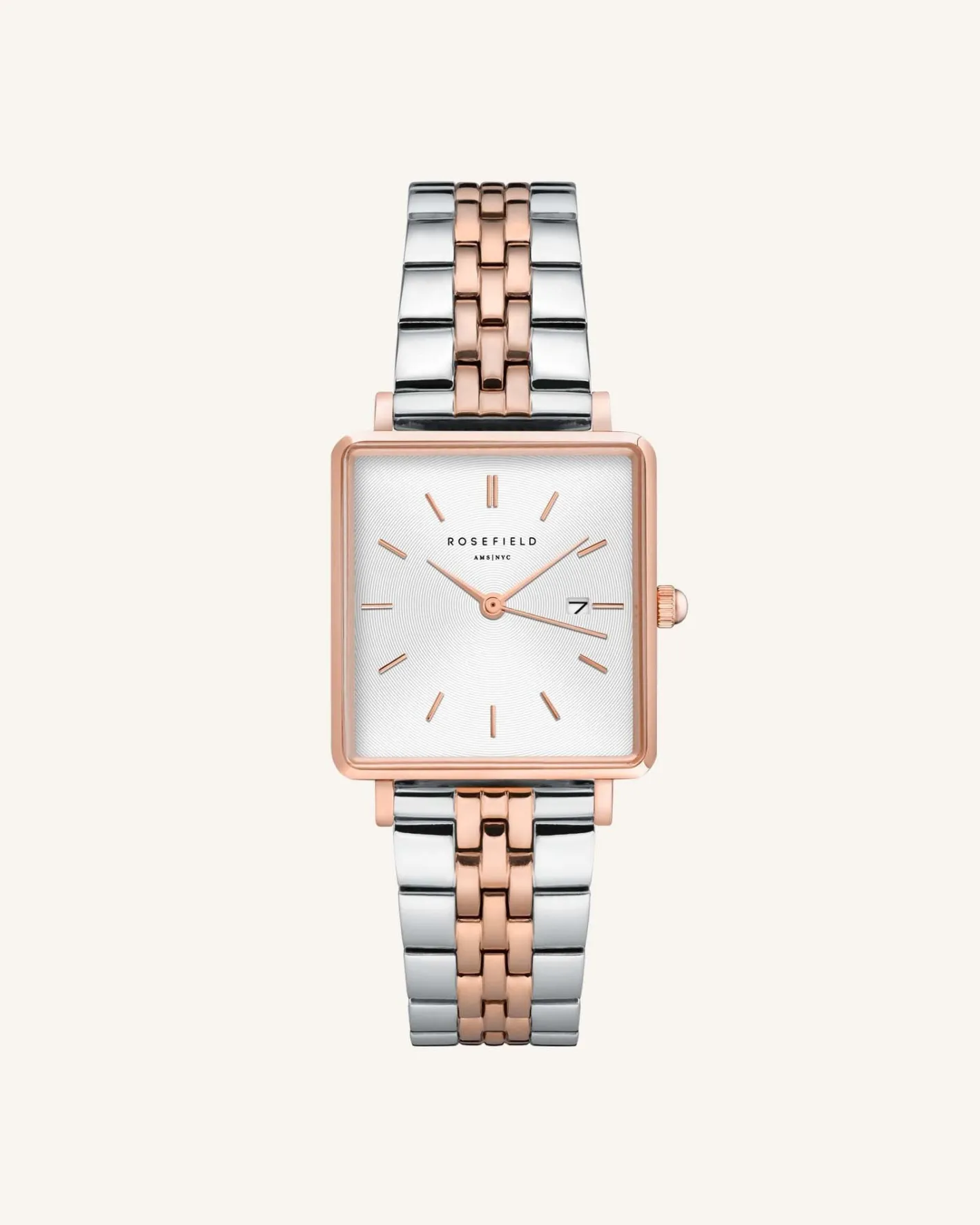 A fresh take on The Boxy watch, these two new duotone styles are a nod to modern luxury. Each watch has either a white sunray etching dial and a stainless steel strap combining 2 metals – silver/rose gold or silver/gold. Stay bold with these mixed metal classics. As a special edition, each of these styles is packed in a Rosefield signature pink box.