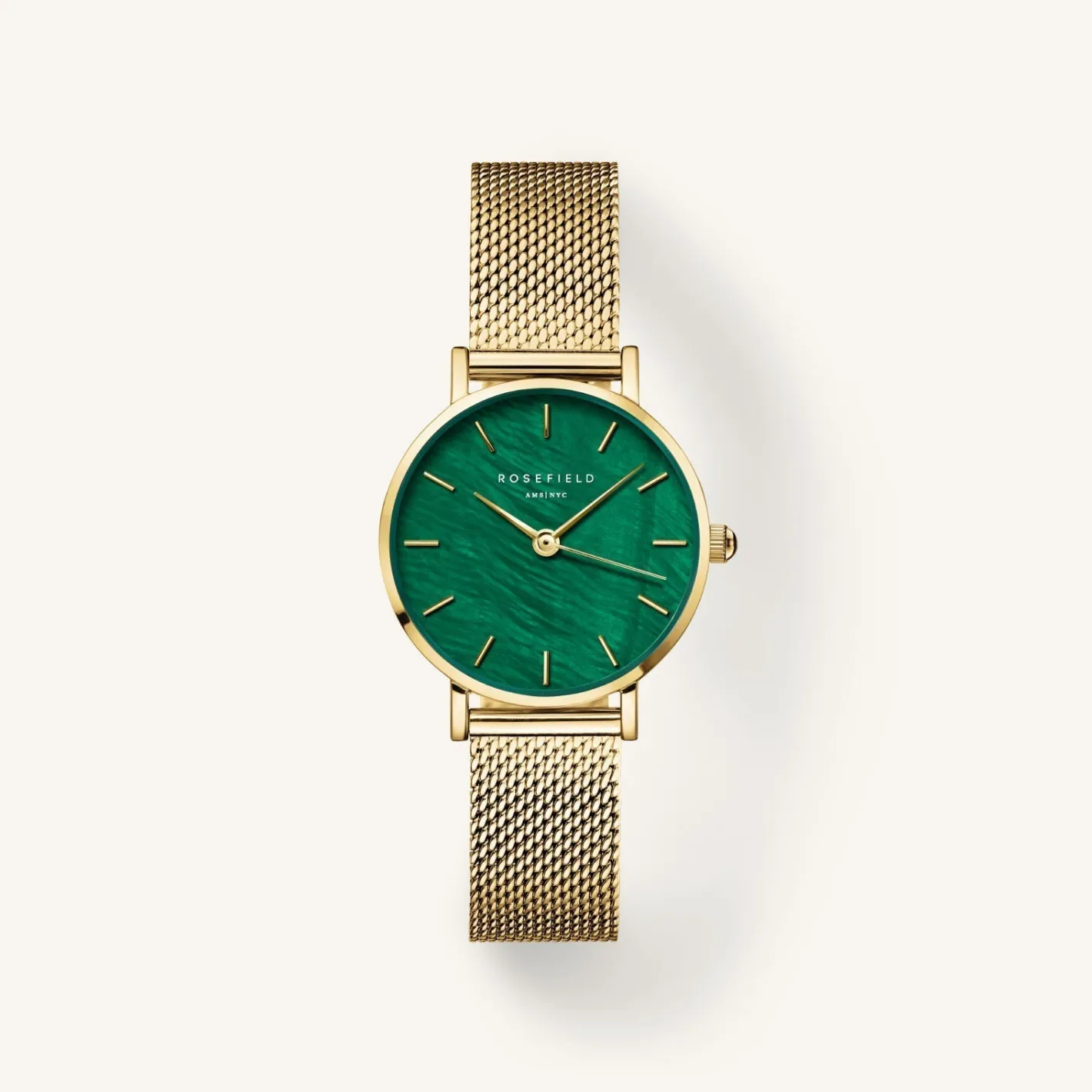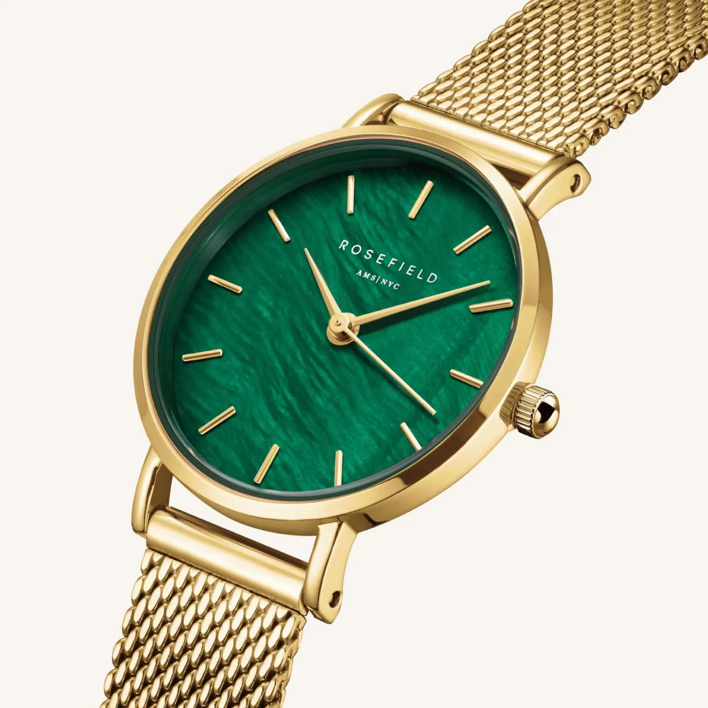 One of the most iconic watch shape with a colorful twist. The emerald green colored mother of pearl dial creates an ever-changing spectacle of light and color, giving a luxury look to this watch.